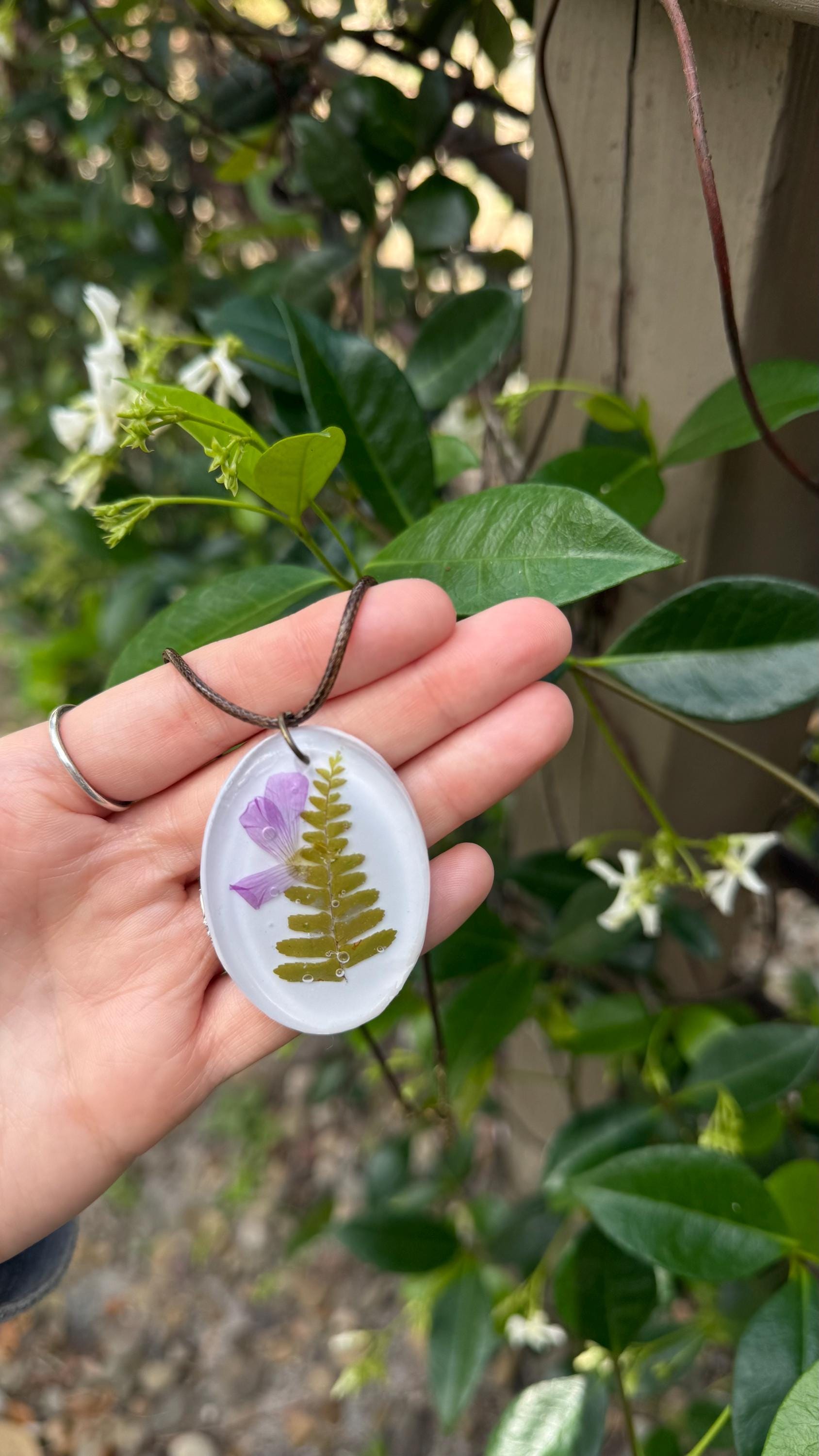 Each pendant is handcrafted using real botanical materials. Because natural elements vary, small differences in color, shape, or placement make every piece one-of-a-kind.